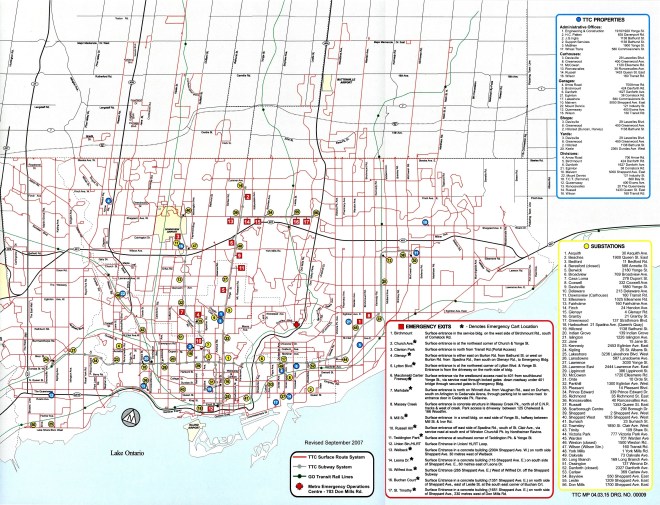 EEBs are provided on the existing subway (and in the Eglinton LRT tunnel now under construction) anywhere that stations are widely spaced and the distance to an exit would be greater than is considered safe. (Similar considerations affect station design and the placement of secondary entrances.) The map below shows the location of all TTC properties including emergency exits (red squares).