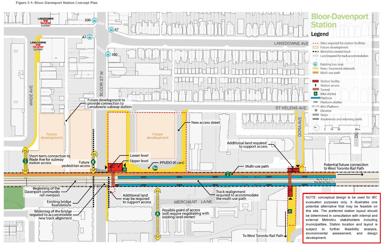 … a GO station at Bloor-Davenport is identified within the City of Toronto’s Official Plan and enjoys strong political and community support. It could help to integrate the GO RER and TTC networks through a potential future connection to the TTC’s Lansdowne subway station, and assist in alleviating pressure on crowded TTC bus routes, particularly for riders with downtown destinations. The station could support access to a growing mix of residential, commercial, and employment uses along the rail corridor, and in particular could improve access to businesses in the Sterling Road and Junction Triangle Communities.