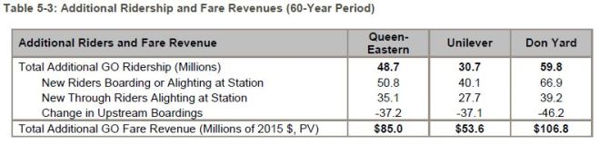Updated March 21, 2017 at 6:51 pm: The Metrolinx study of stations at the Don River on the Lake Shore corridor does not include the effect of proposed employment at the Great Gulf “East Harbour” site. Therefore the ridership projections and comparative evaluations of stations are based on a situation where this major proposed node does not exist. I have added a relevant quotation from the study to illustrate this.