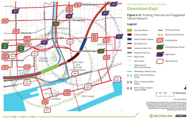 This is the same location as a possible future Relief Line subway stop, and it is obvious that any construction here should take this into account up to the point of prebuilding any structures the RL might require to avoid future disruption. A good argument could be made that stopping both routes here would be overkill for a comparatively minor development location, especially in light of the plan to have a joint station only a short distance further southwest at the Don River.