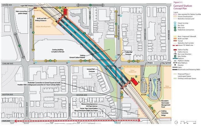 The Gerrard/Dundas station would lie between Carlaw Avenue (where the rail corridor crosses Gerrard Street) and Logan Avenue at Dundas. A considerable amount of the demand projected for this station depends on redevelopment of commercial property around the corridor between Carlaw and Pape, as well as transit feeder services using bus routes extended south from their current terminus at Pape Station.