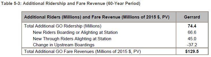 This station faces the same competing forces for attracting and discouraging riders as the set of proposals for a station at the Don River (see above). Riders would be atttracted to the line for a faster trip downtown, especially if they were bound for the immediate vicinity of Union Station, but the extra stop would discourage some riders from further east. The two effects would not balance, and a net loss of riding is projected. This site also would be affected by the proposed addition of a fifth track to serve express trains further west, and this could add to property requirements for a Gerrard Station.
