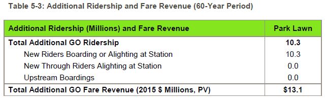 Obviously Metrolinx is not considering or falsely expecting the long term benefits of the potential Park Lawn station. Logically, with the current pace of the development of new condos, the population increase will proliferate. Metrolinx is maybe assuming the increase in population as per historical record or at a straight line.