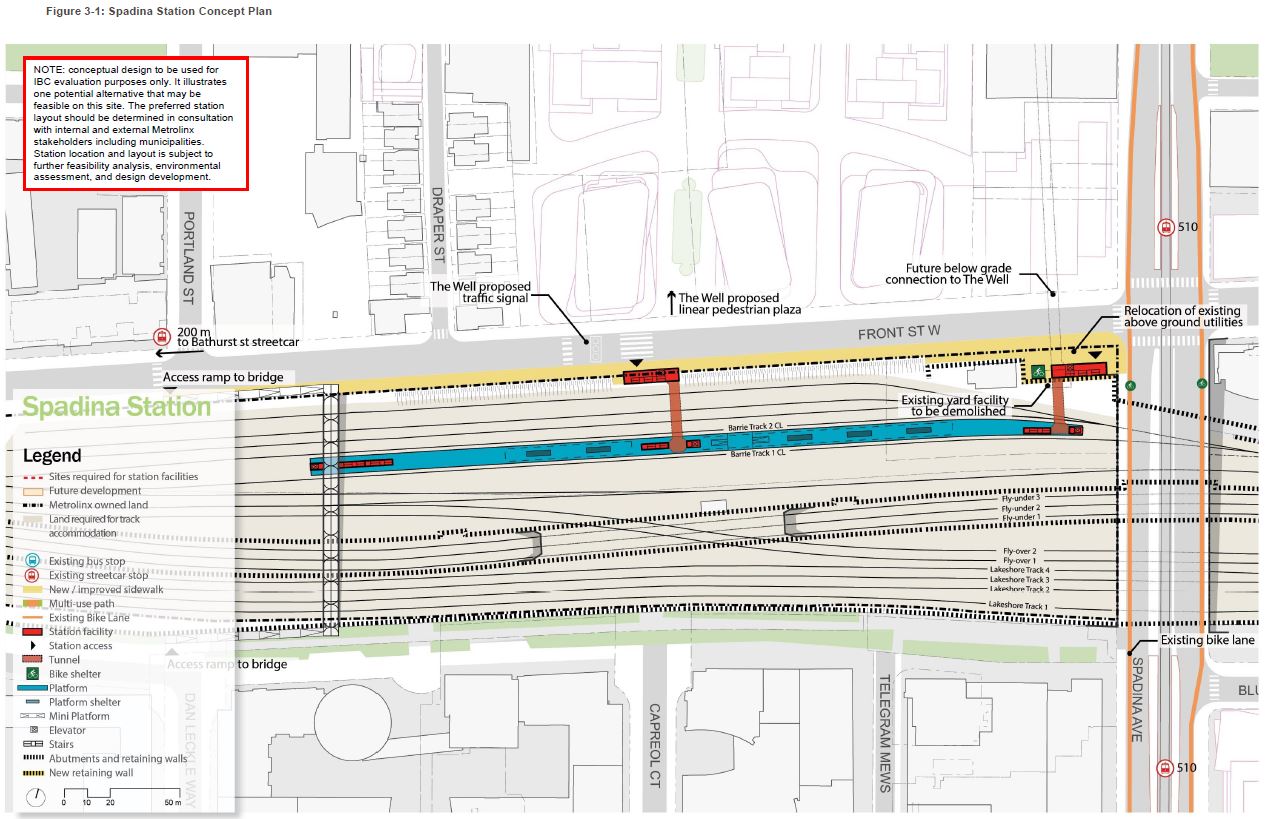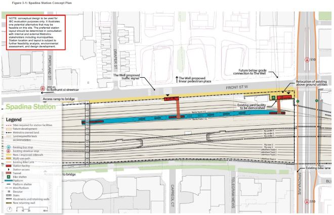 A new station is proposed on the north side of the existing GO Bathurst Yard on the south side of Front Street just west of Spadina Avenue. This station would differ from an earlier proposal for this site: