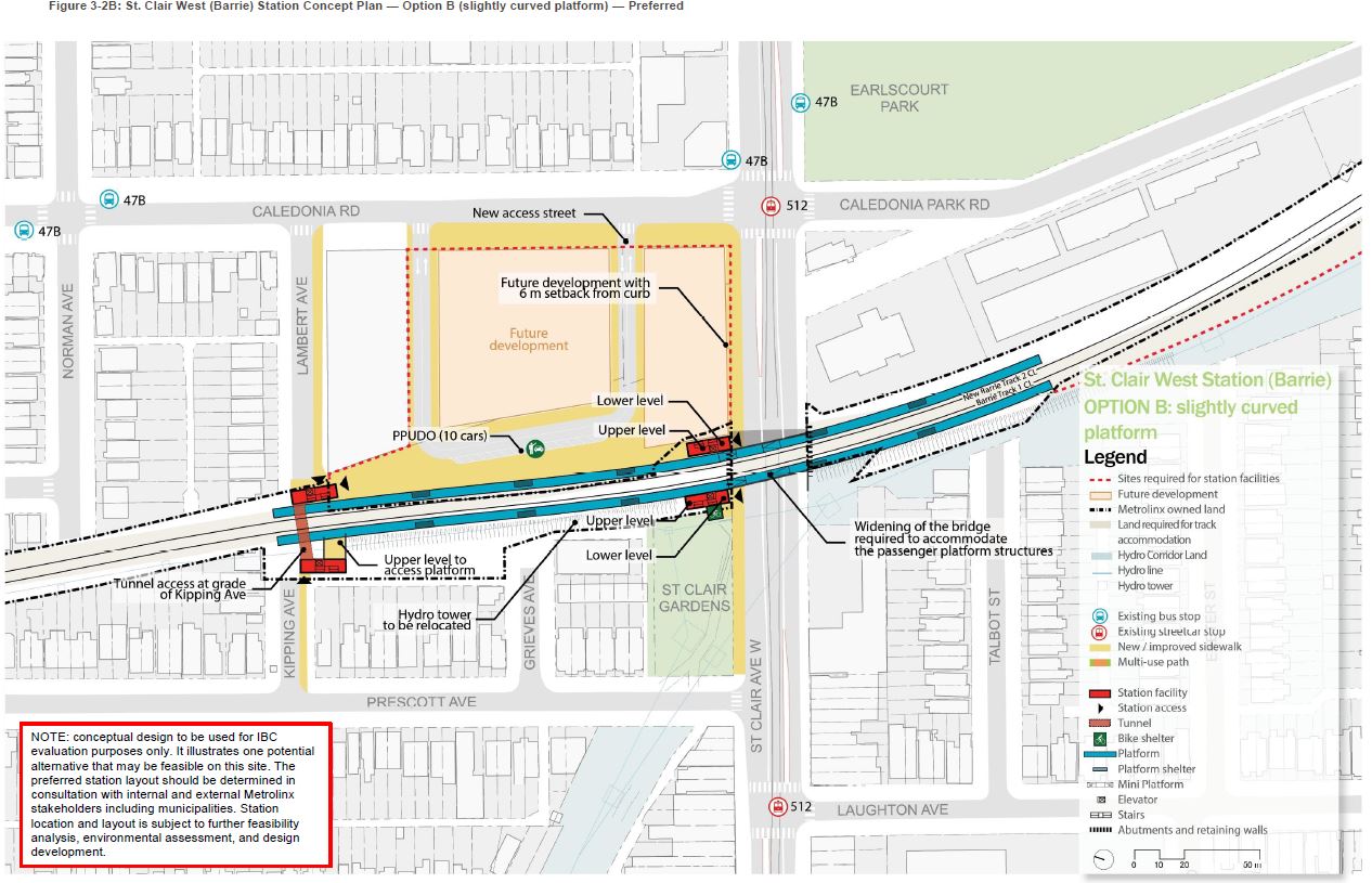 Two options for this station were considered. Option A locates the station north of St. Clair and avoids issues with both the curve and grade change to the south. However, it raises problems with adjacent structures. Option B shown below straddles St. Clair and is preferred. However, this station is not included in the GO/RER expansion program.