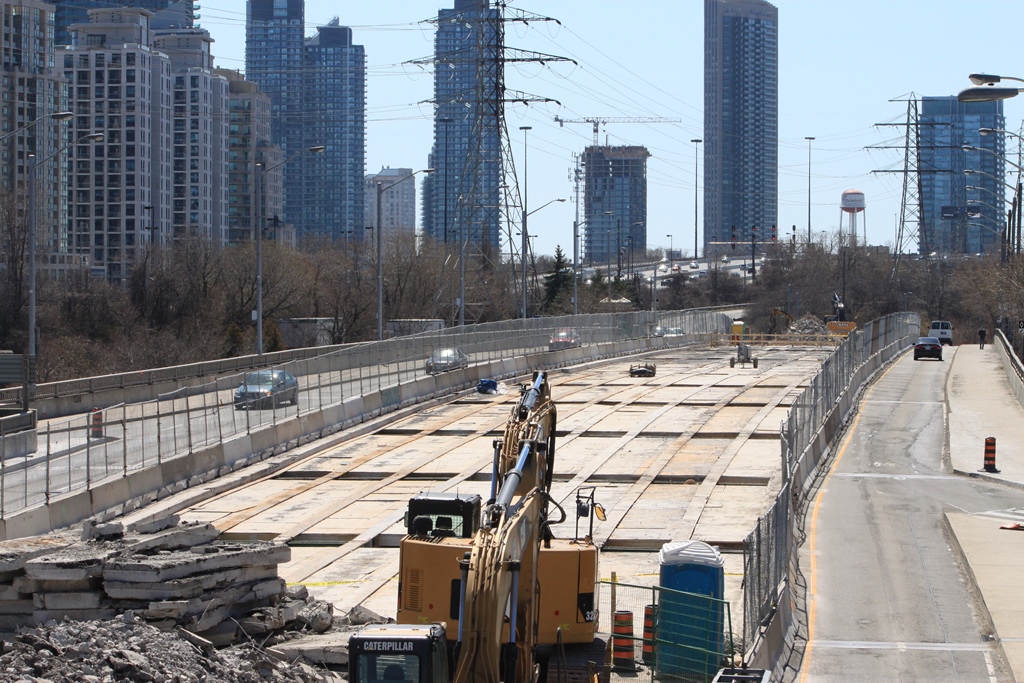 IMG_7265w Published April 14, 2017 at 1024 × 683 in Reconstruction of The Queensway and Humber Loop (Updated January 28, 2018) ← Previous Next → West on The Queensway across the Humber River Bridge This span normally carries the streetcars, but will be used temporarily for road traffic while the north and south spans are rebuilt.