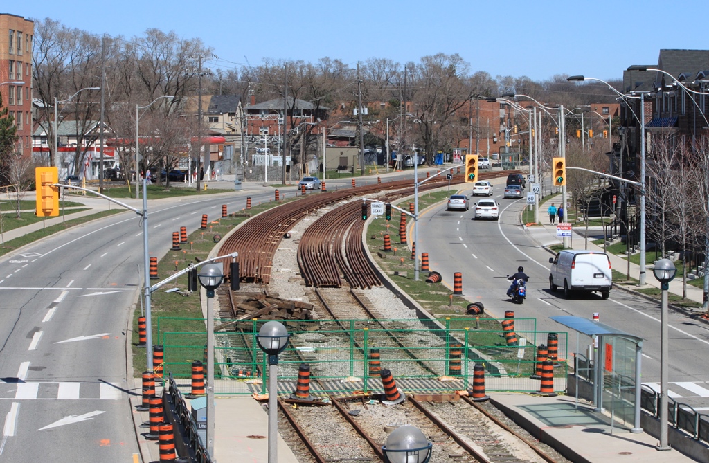 IMG_7266w Published April 14, 2017 at 1024 × 669 in Reconstruction of The Queensway and Humber Loop (Updated January 28, 2018) ← Previous Next → East on TheQueensway from South Kingsway Strings of prewelded track await placement on a new roadbad.