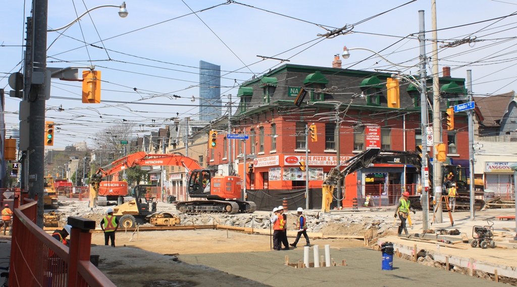 IMG_7420w Published May 20, 2017 at 1024 × 568 in Reconstruction of Dundas & Parliament Streets Next → Looking NW across Parliament Demolition of the west and north quadrants in progress