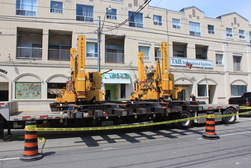 IMG_7425w Published May 20, 2017 at 1024 × 683 in Reconstruction of Dundas & Parliament Streets ← Previous Next → Central diamond awaiting placement on Parliament south of Dundas The pair of track cranes perched on the diamond are used to “walk” track panels off of their delivery trailers into position.