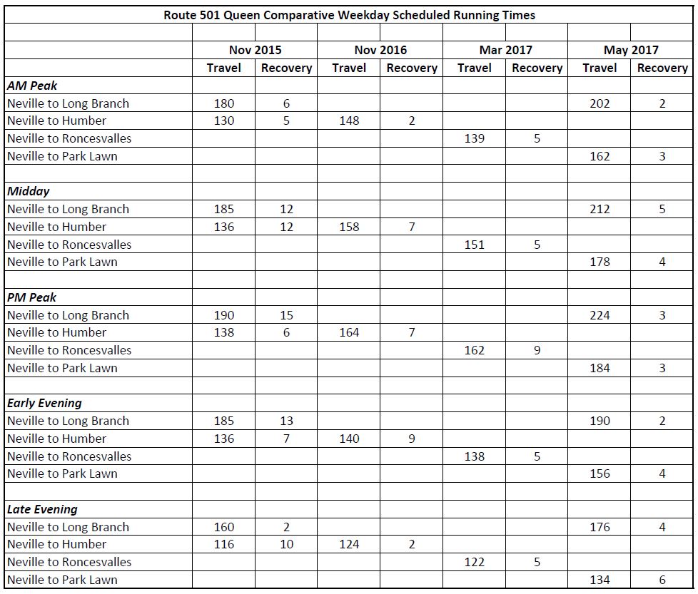 In May 2017, buses replaced streetcars. The running time to Long Branch is longer than the November 2015 streetcar times, but by amounts comparable to the changes made to the streetcar schedules in the intervening period. It does not appear that any provision has been made for extra time that will be needed by buses once construction starts in earnest on Lake Shore, and this will soak up some of the excess bus operators now enjoy.