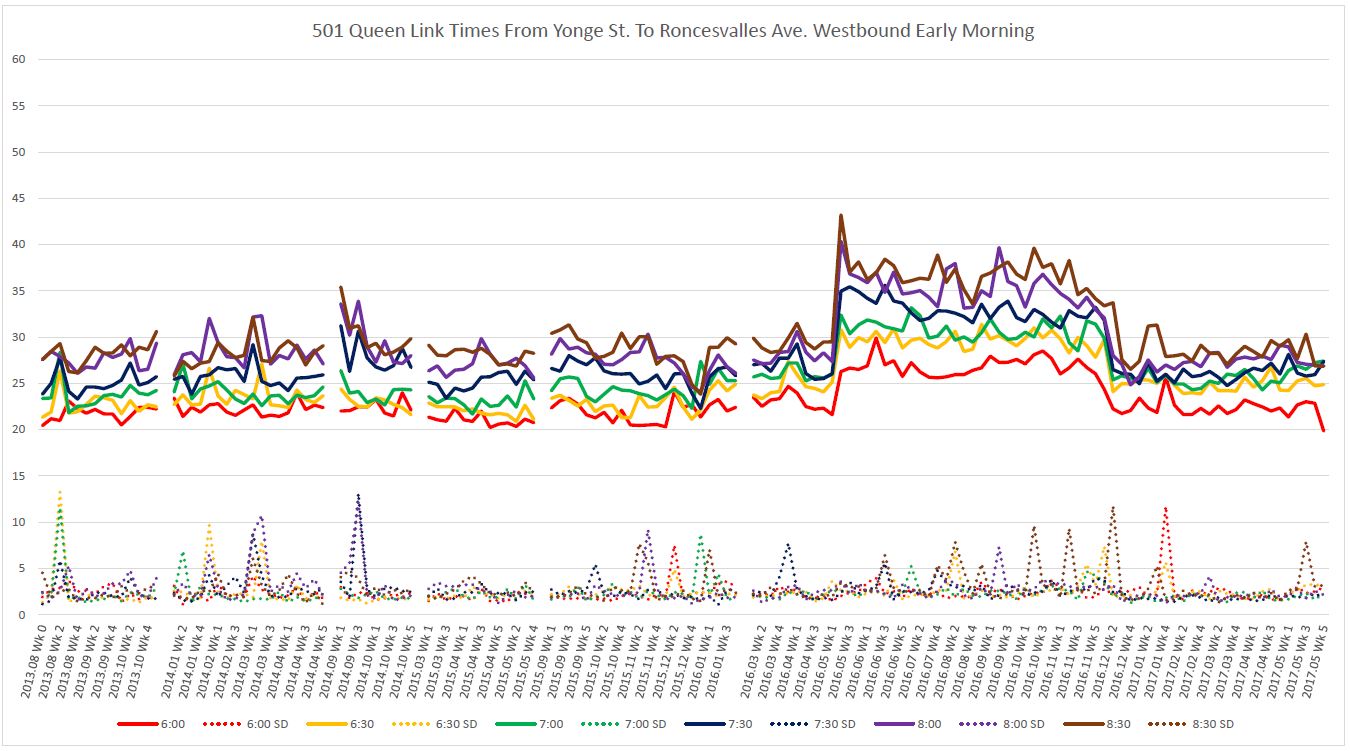 In the first article I reviewed vehicle tracking data for April 2017 when Queen was operating with streetcars between Neville Loop and Roncesvalles with data for May 7-31 after the route had been converted to buses. This look at month-long averages gives an initial impression that buses are faster under certain circumstances (period of lighter load and less traffic congestion), but this prompted me to look at other data to see if the pattern was consistent. What quickly appeared was that April 2017 was an unusually bad month for the route, and so average travel times in some areas were pushed above what is seen in other periods.
