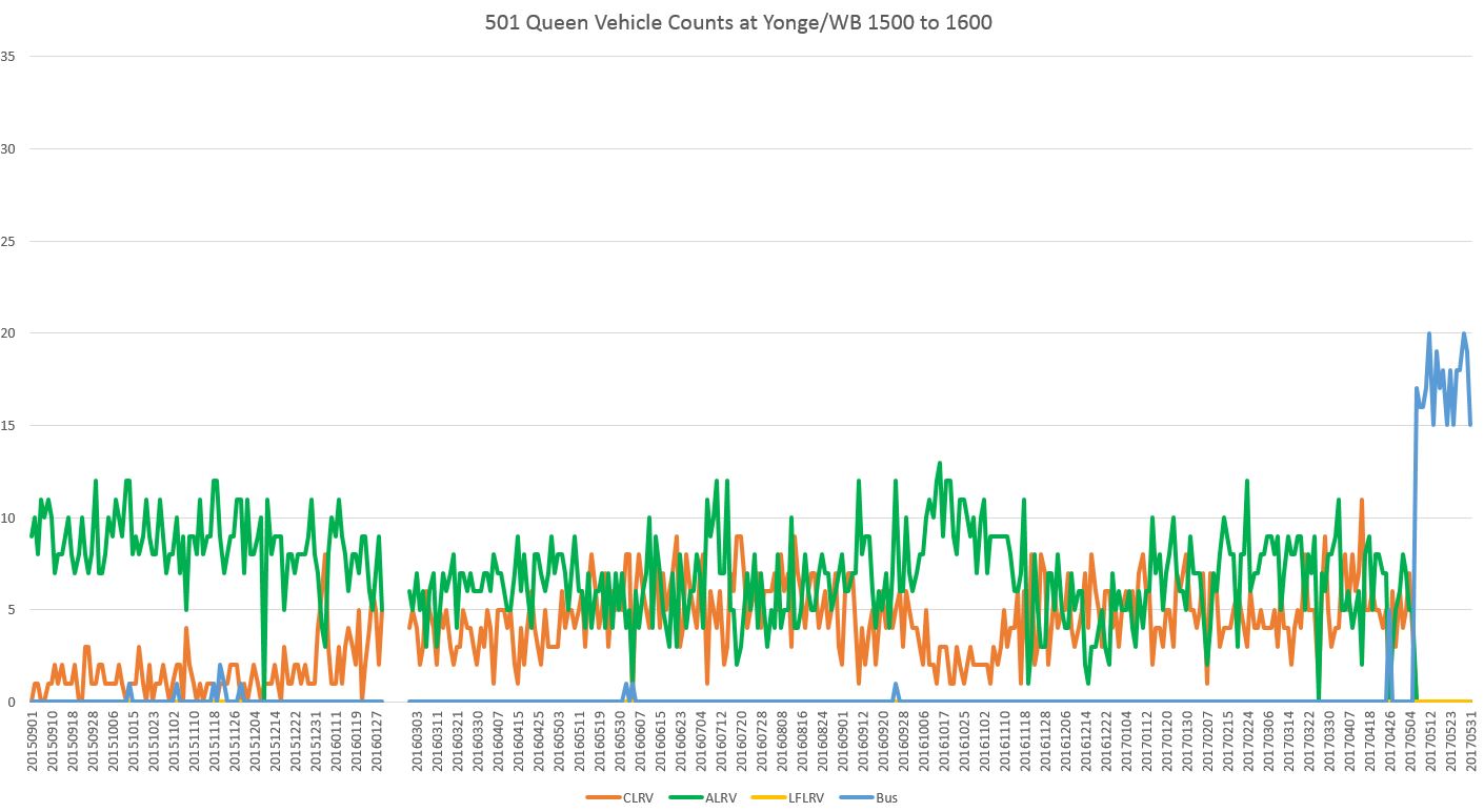 The first chart type (below) plots the vehicle counts by type with CLRVs in orange, ALRVs in green and buses in blue. Of course there should not be any CLRVs on this route, but it is clear that they have contributed substantially to operations going back to late 2015. The use of ALRVs has been correspondingly reduced during most periods and this has affected route capacity.