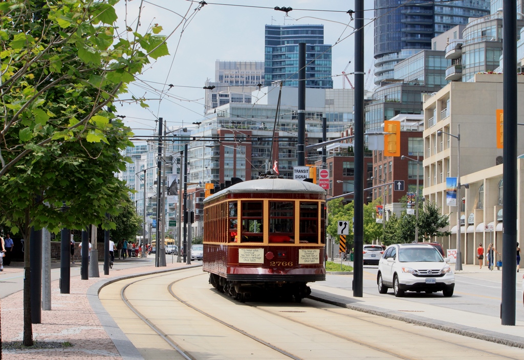 Witt 2766 WB at the “crossover” Published July 1, 2017 at 1024 × 704 in An Unusual Visitor to 509 Harbourfront ← Previous Next → The Queens Quay rebuild ended at this point, and traffic from here west to Bathurst straddles the tracks in the conventional manner.