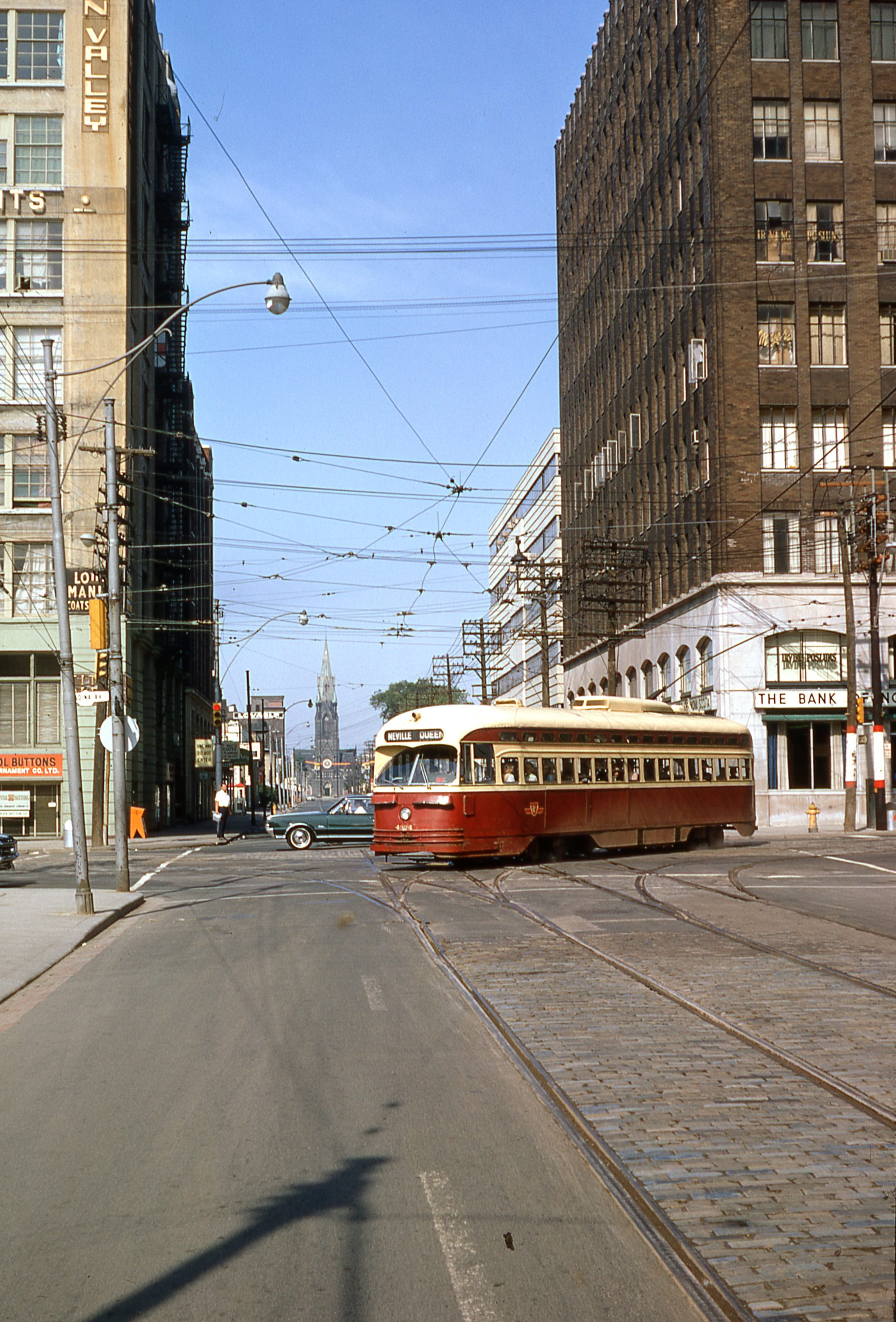 B3_670701_331 Published June 20, 2017 at 2186 × 3225 in Canada (er … Dominion) Day 1967 ← Previous Next → Turning S to E from Spadina into Adelaide The Bank of Nova Scotia had not yet morphed into “Scotiabank”. The track and overhead for the connect from Bathurst, abandoned in 1966, end abruptly on the west side of the intersection.