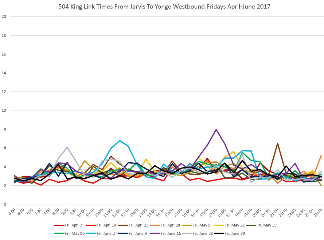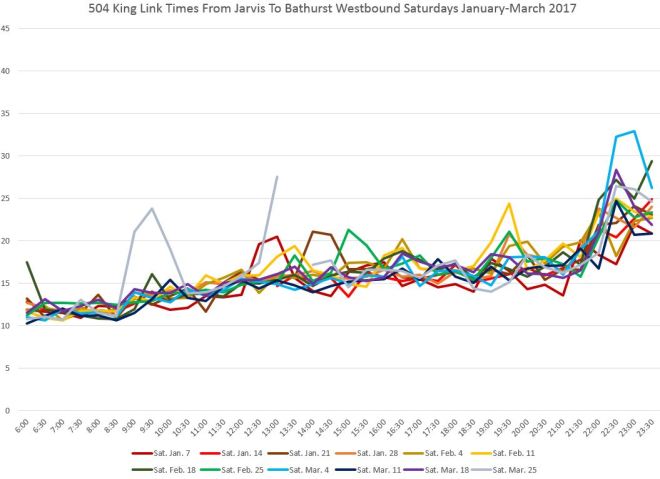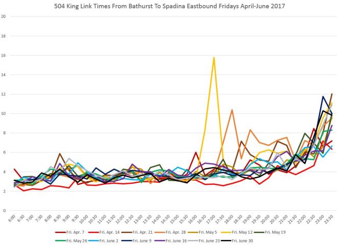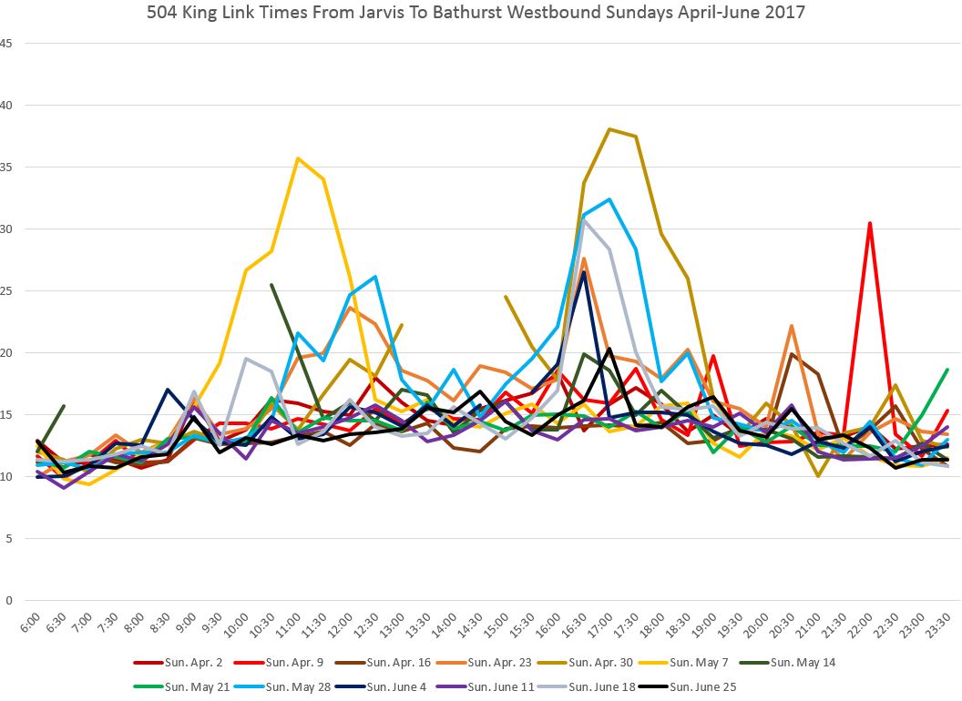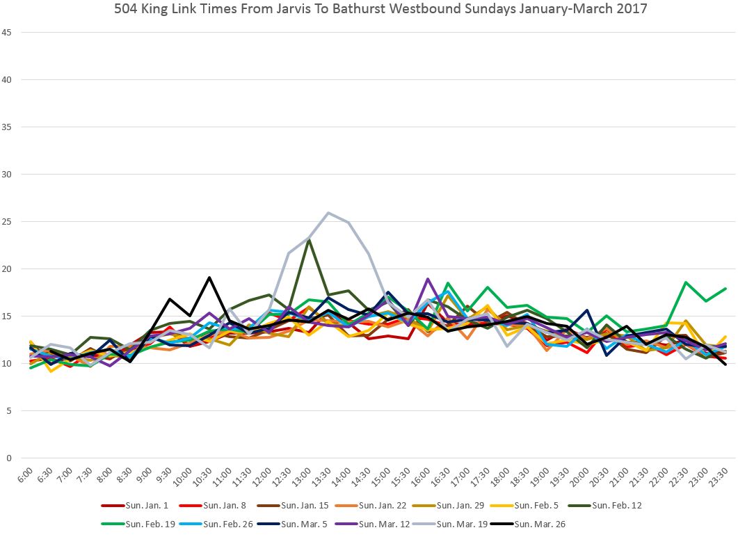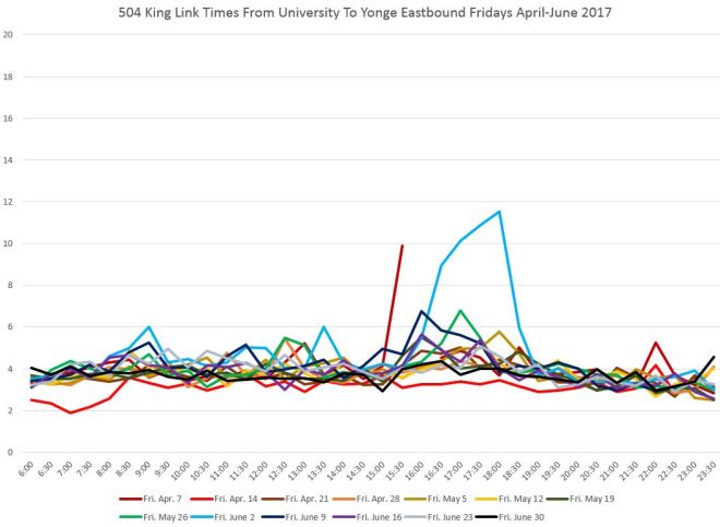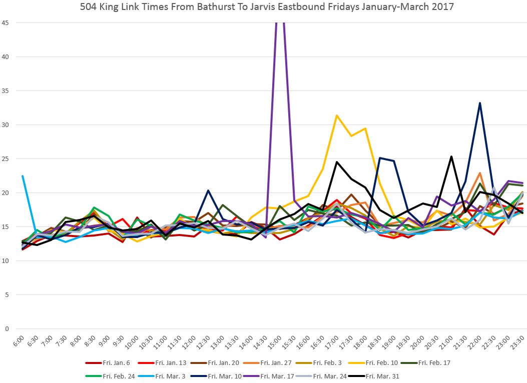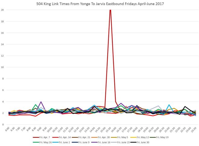 There is no congestion east of Yonge Street, and except for a delay on April 14 (ironically itself a holiday), the travel times to Jarvis are consistent all day long.