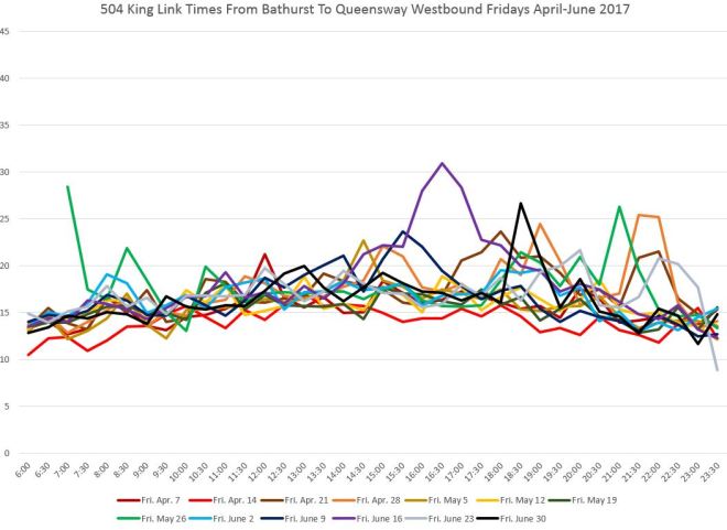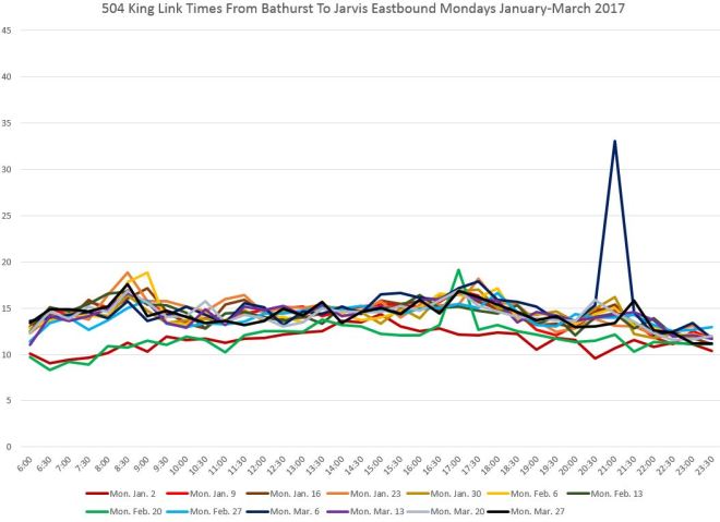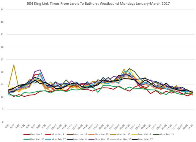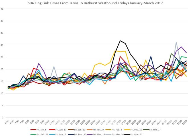 The two charts below show the travel times, averaged by half hour, for each Monday and Friday in the months of January-March 2017 westbound from Jarvis to Bathurst.