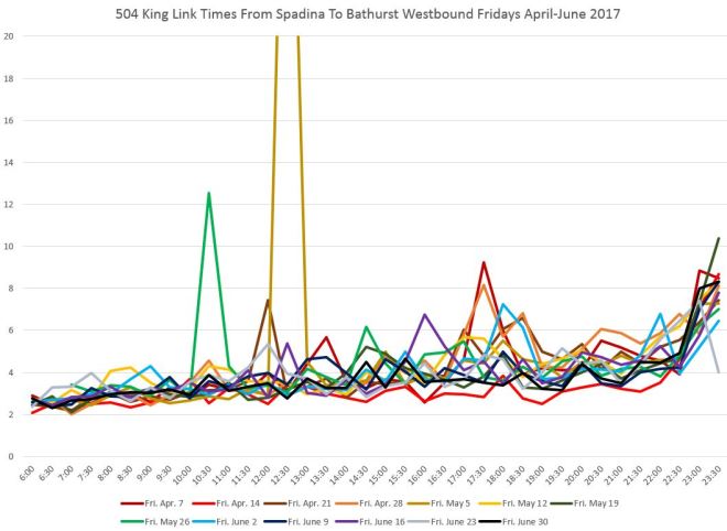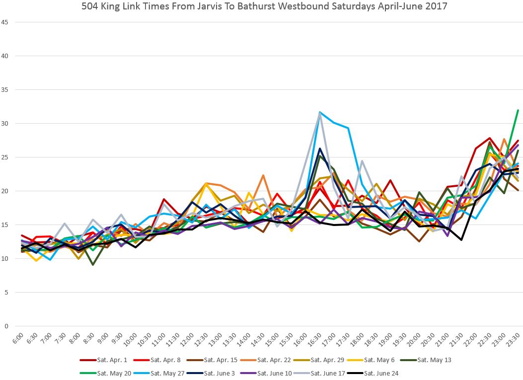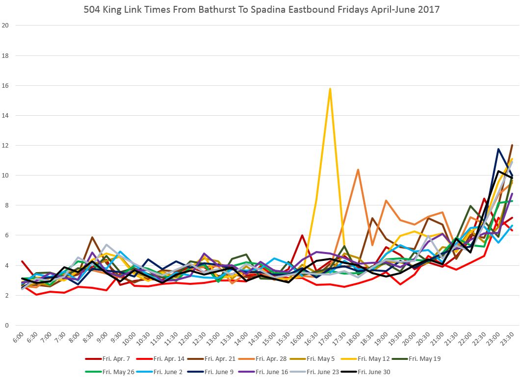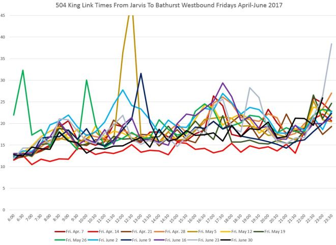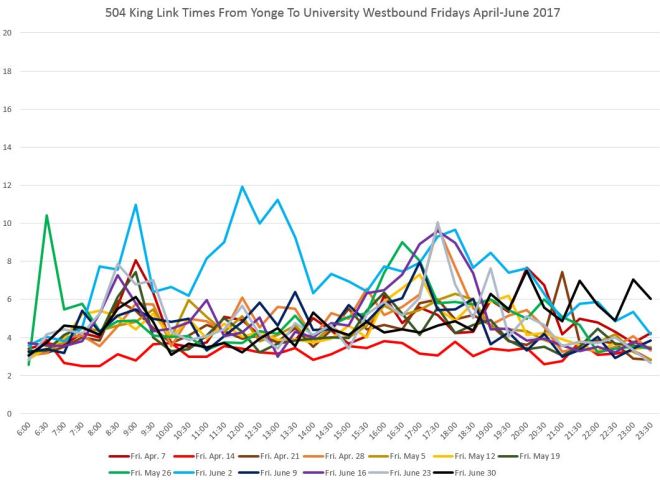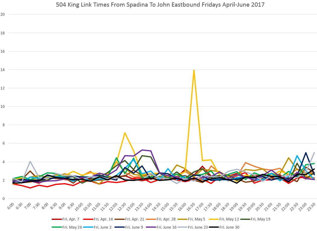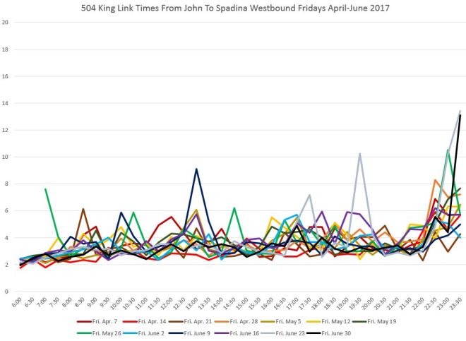 Travel times from John to Spadina are affected during most of the day by congestion at the Spadina intersection. This can be particularly bad if, due to service disruptions on 510 Spadina, many streetcars are attempting to use Charlotte Loop. The late evening effect of the club district is quite obvious here, although this is limited generally to Fridays and Saturdays.