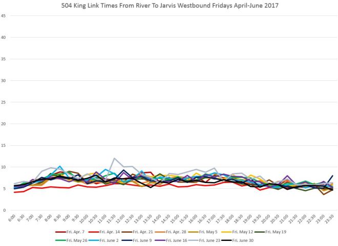 Variations in travel times between Jarvis and River are small throughout the day. Here is the Friday chart: