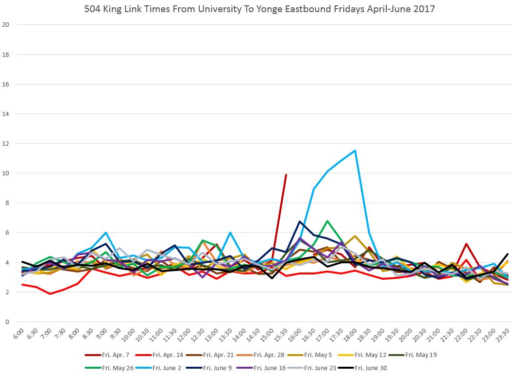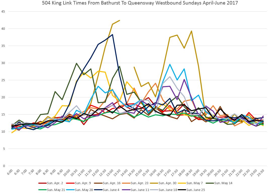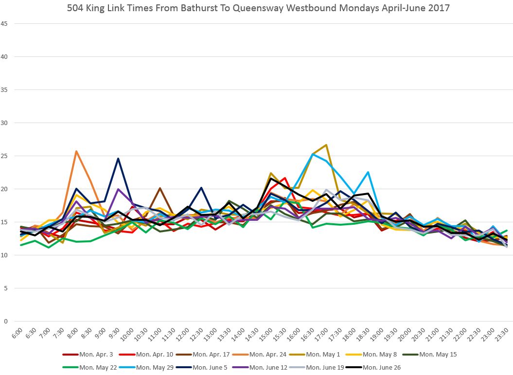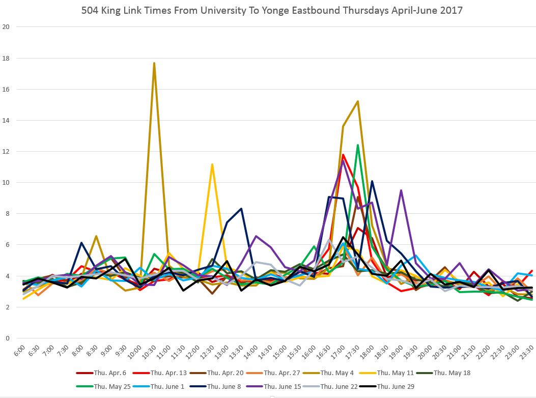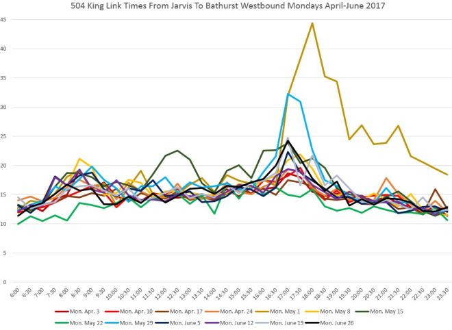 The very high peak on May 1 was caused by the electrical fire in a Hydro vault at King and Yonge that required all service to divert via Queen Street. Monday May 22 was Victoria Day with slightly lower than usual travel times.