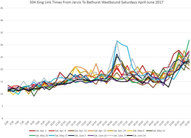 This article reviews TTC vehicle tracking data for the first half of 2017 on King to illustrate the variation in travel times for the Jarvis-to-Bathurst pilot area, smaller segments within the pilot, and the segments beyond. Advocates for transit priority on King routinely cite congestion and longer travel times as major issues that the pilot can deal with, and indeed journey time reduction is one of the goals of the project. However, the 504 King service operates in a more complex environment than just a congested central section, and that context must be understood in evaluating the benefits any change will bring.