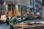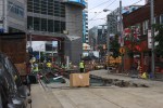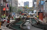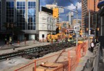Concrete work continues on the east leg of the intersection, and the special work for remaining sections is sitting on Victoria Street south of Dundas Square awaiting installation.