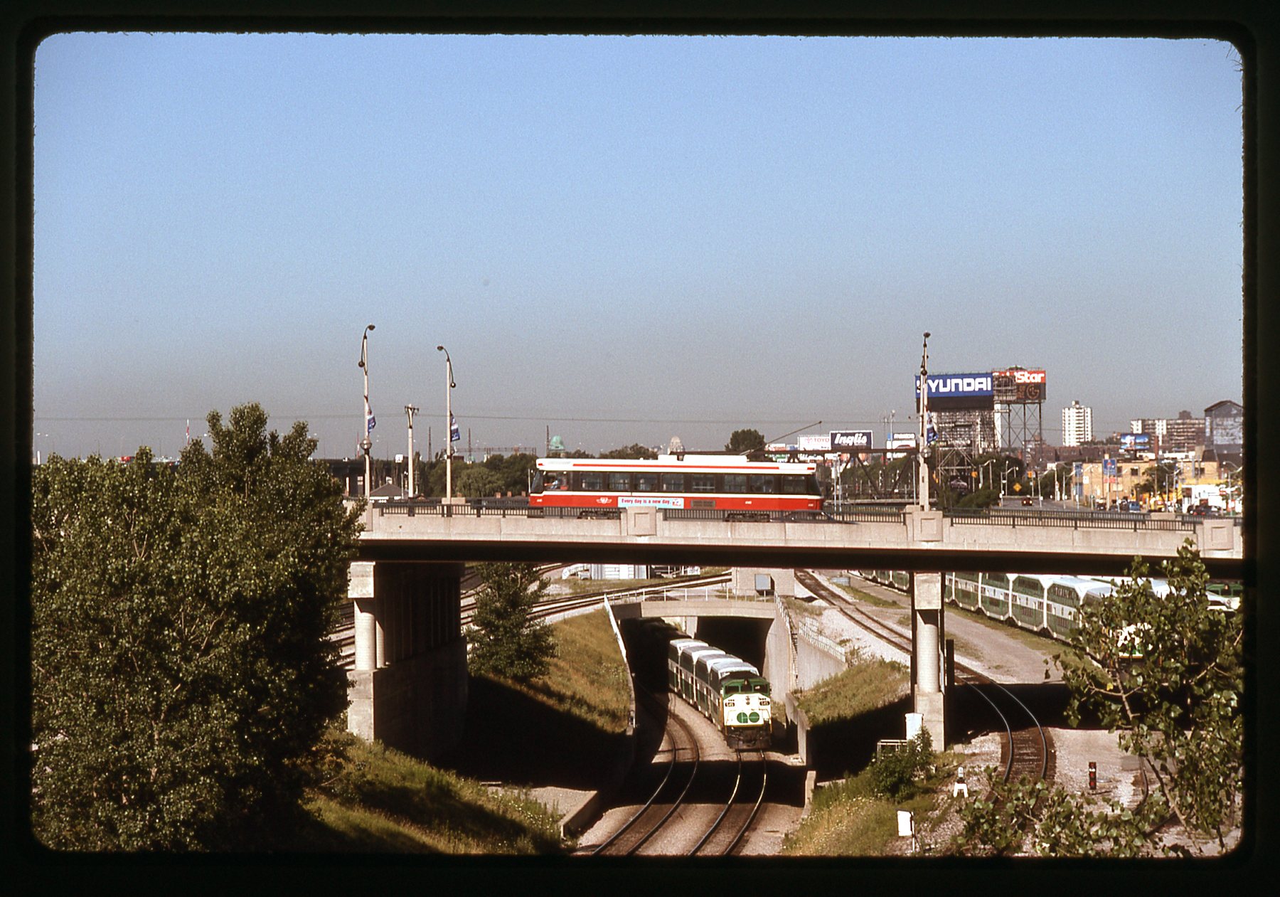 Published July 26, 2017 at 1800 × 1261 in The Spadina Streetcar Turns 20 (Part II) ← Previous Next → South of Front looking W This photo was taken from the John Street bridge before the forest of condos here and to the west (Liberty Village) existed.