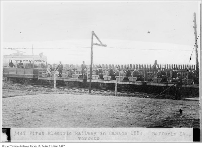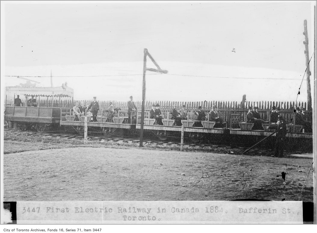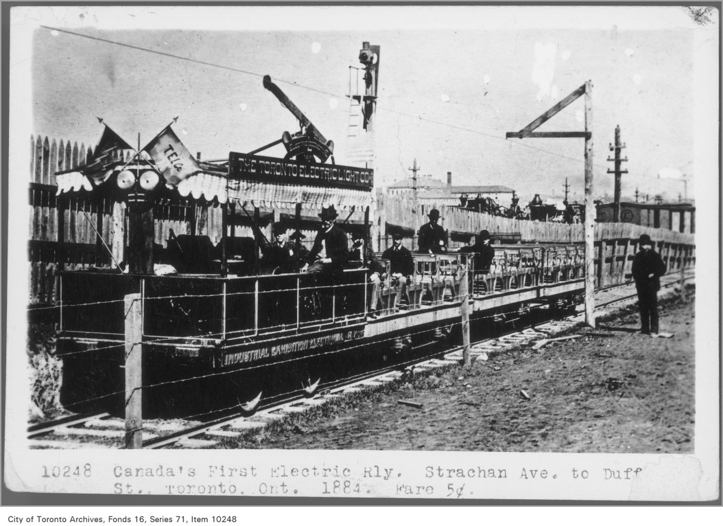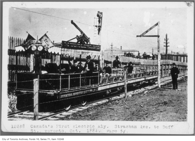 From 1883-1891, an electric railway operated from Strachan Avenue to Dufferin Street in the Canadian National Exhibition grounds, then known as the Toronto Industrial Exhibition. The line was a demonstration by J.J. Wright of the Toronto Electric Light Co. and Charles Van Depoele, described in the archives as “a Belgian-American street railway promoter”.