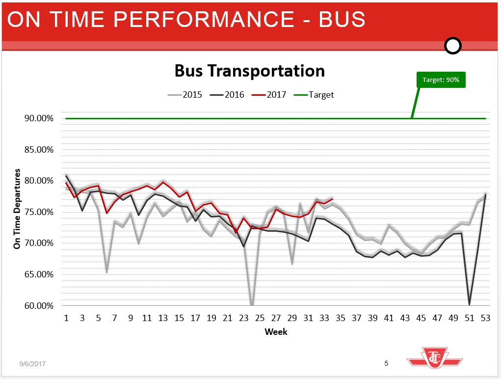 The bus network does better, but it has proportionately more trips on route where traffic effects serious hamper operations. This can dilute the stats relative to the streetcar lines. To be meaningful, the TTC should break out route-by-route information, something they have “promised” to do in their Customer Charter, but have failed to deliver since the beginning of 2015.