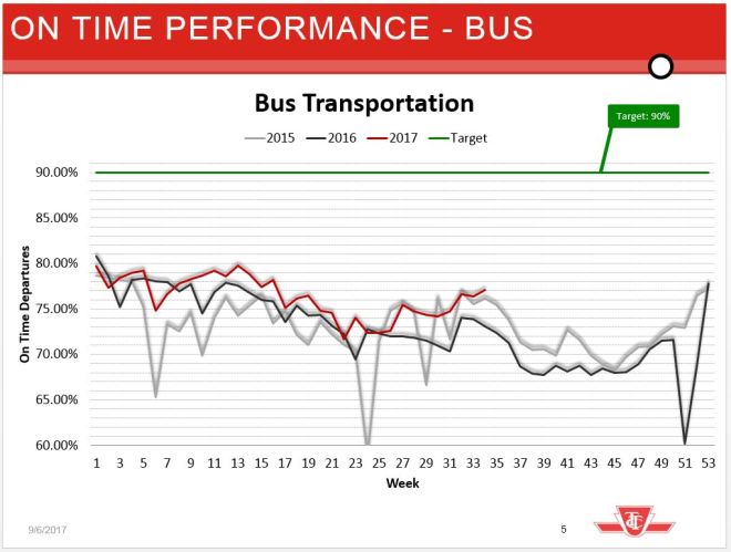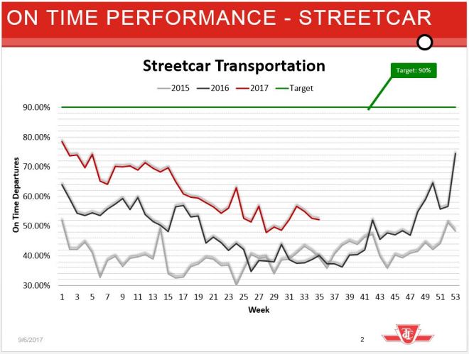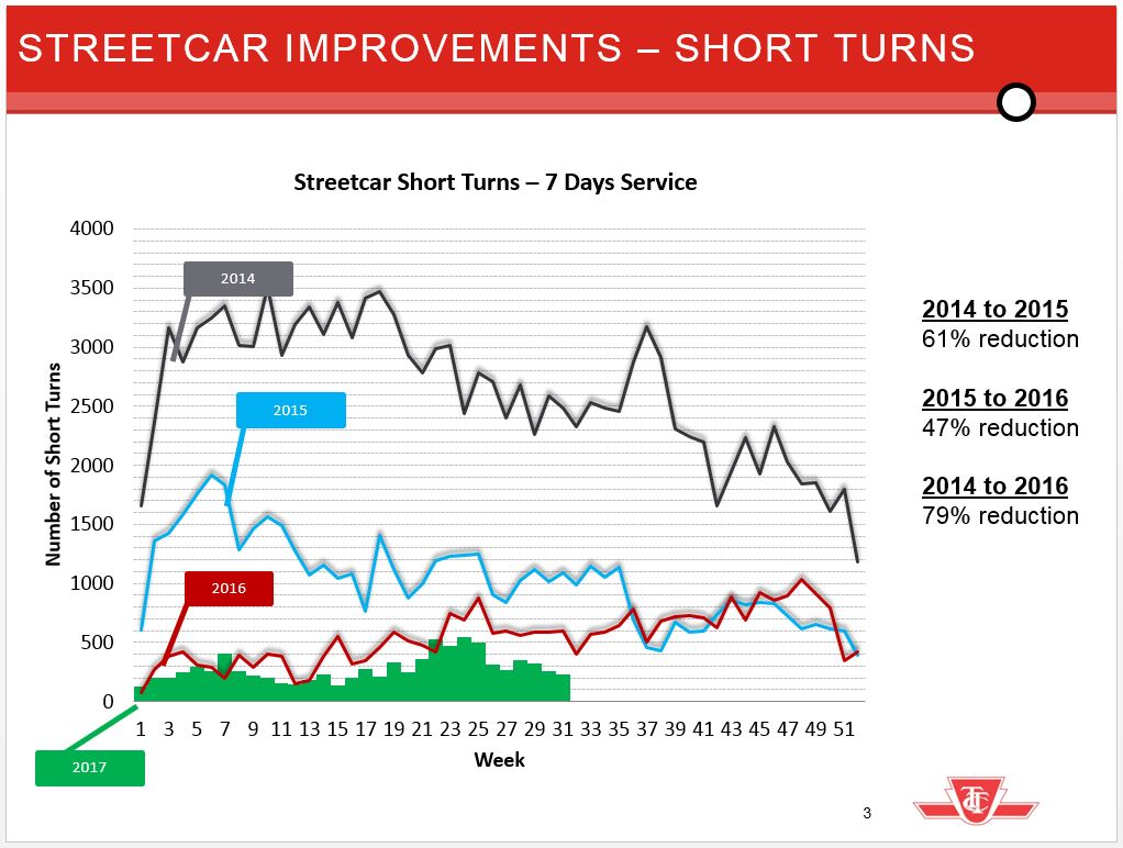 For both the streetcar and bus networks, the stats for 2017 are running ahead of past years, although much more dramatically for streetcars. “On time” is defined as a vehicle leaving its terminal no more than one minute early or five minutes late.