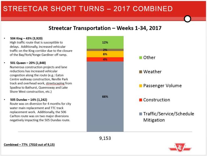 Short turn stats are broken out for the “high rollers”, the routes that contribute most to the total. It is interesting to compare the relative importance of “construction” for the two modes. Although the streetcar network has seen a great deal of this in 2017, little of the short turns are ascribed to that source with the bulk identified as traffic and related problems. By contrast the percentage for buses is much higher. It is unclear whether this is the result of different reporting standards for the two modes.