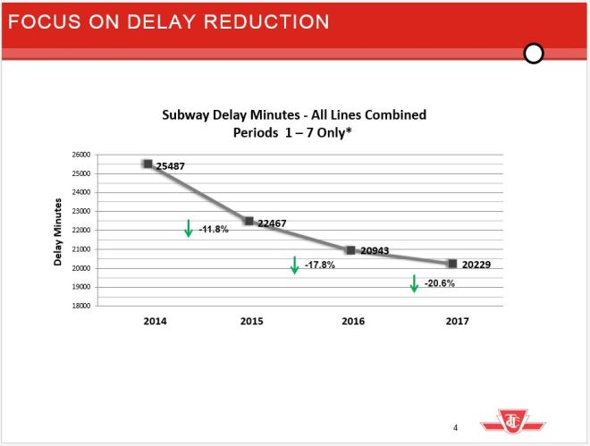 Delay minutes have been falling since 2014, although the number of delays has not declined as much (as reported at other meetings). This results from the TTC’s changing its delay handling procedures to reduce the time to clear a delay so that events do not have as great an impact on service as before.