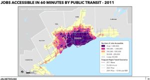 The biggest problem with these maps is the use of a 60-minute screen in a region where the average commute, especially by auto, is considerably smaller. Moreover, there is no indication of the starting location for these trips, and the maps will be very different depending on whether one begins at Yonge and Eglinton, Malvern, Central Mississauga, Hamilton, Richmond Hill or Oshawa.