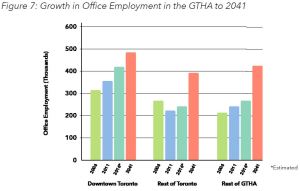 Office employment, which is a major driver of transit use, is becoming increasingly concentrated in downtown Toronto and in a few large suburban employment centers (see Figure 7). Importantly, significant employment is also occurring outside the designated Urban Growth Centres and away from existing and planned rapid transit services. Suburban employment areas continue to be designed around the car, and are difficult to serve by transit and to navigate on foot or by bicycle.