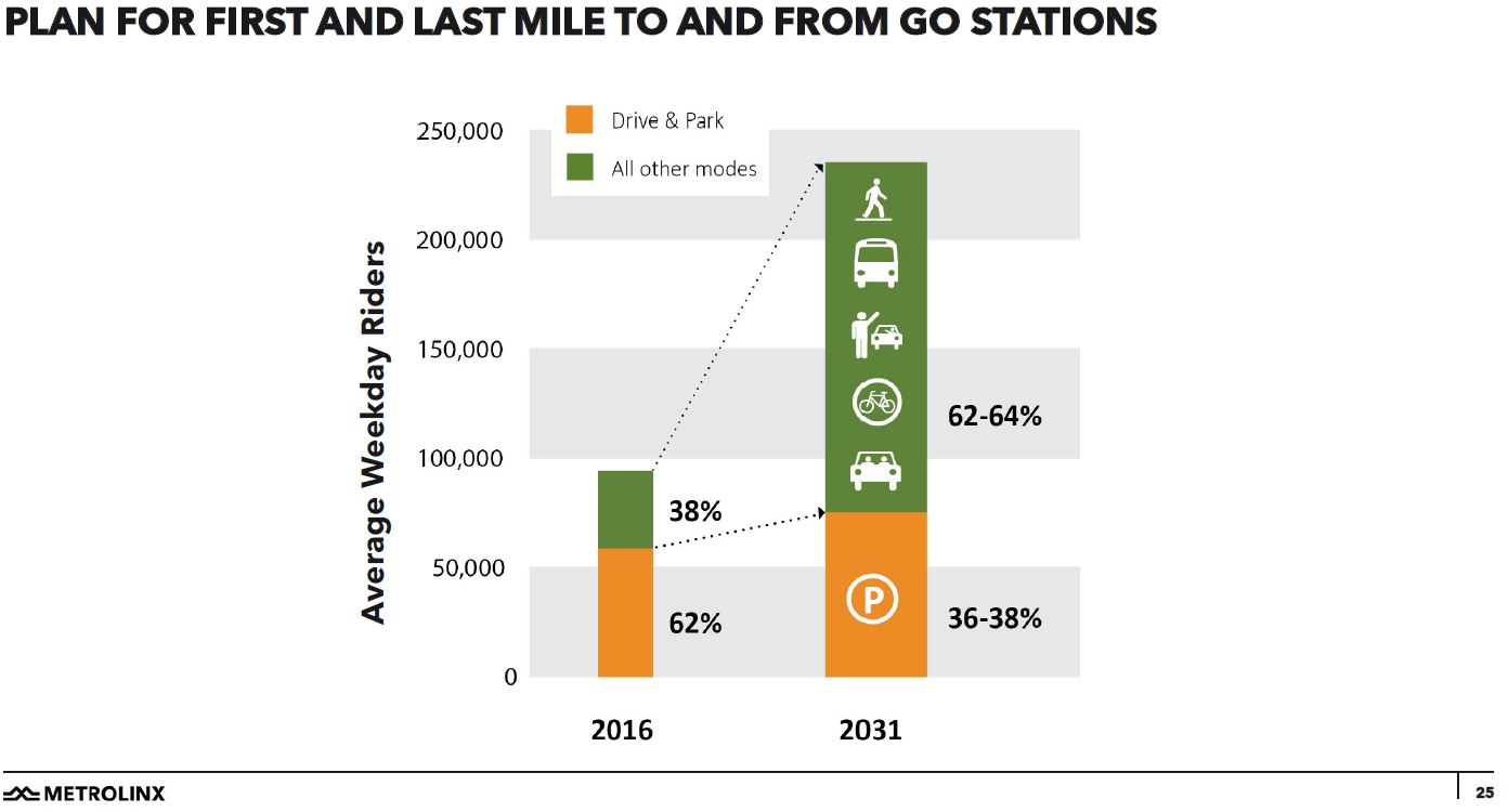 I had a very different reaction to the plan. As I understand it: a) over its 40 year history, increases in ridership have been very closely tied to GO Transit’s willingness to provide parking (see page 12 of its December 12/16 GO Rail Station Access Plan for an interesting chart); b) Metrolinx now intends to radically change this relationship and has planned for the park and ride share to plummet from 62% of weekday riders to 36%/38% in 2031; c) at the same time they forecast total regular weekday rides will climb from 100,000 in 2016 to 225/250,000 in 2031.