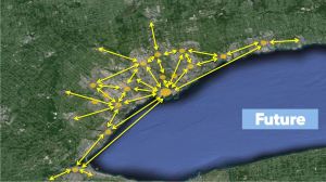 In the 1970s, when GO Transit was a small-scale operation on the Lake Shore corridor, the focus of commuting was downtown Toronto with smaller nodes at Toronto International Airport (the name “Pearson” would come in the 1980s) and at Hamilton. Much of what we now call the GTHA was still farmland. By the new millenium, many jobs, but equally importantly many homes, were to be found in the outer part of Toronto and the regions beyond. This produced travel demands not just for commuting, but for all types of travel in areas poorly served by transit. Even within Toronto, the network design focused on moving riders to the subway and thence to the core area for work and school trips. Over the past two decades, suburban commuting demands have become more complex as more and more jobs spread over the area, and the many-to-many travel pattern is almost exclusively served by autos.