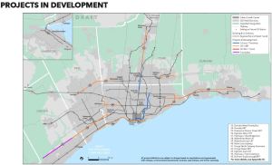 On the second map, projects “In Development” include the DRL on which $150 million has been allocated for design work, but actual construction will present severe sticker shock. The only reason the DRL gets any attention is that York Region’s dream of a Yonge Subway extension cannot be built unless the capacity problems further south are resolved.