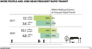 The chart tells a very different story. Between 2011 and 2041 the number of people in the GTHA will rise from 7.2 to 10.1 million. Although a larger proportion of them will be in “walking distance” to frequent transit, the percentage will be under 40 per cent. This is four times the proportion in 2011, a value so low it is no surprise that the dominant form of travel is auto, but a majority of the population remains beyond an easy reach of transit. The situation for jobs is slightly better, but still over half of the region’s jobs will be beyond frequent transit. There is a disconnect here in that job locations will be proportionately better served than home locations making access to transit for many workers challenging, and reinforcing the notion that transit is not a reasonable alternative for many.