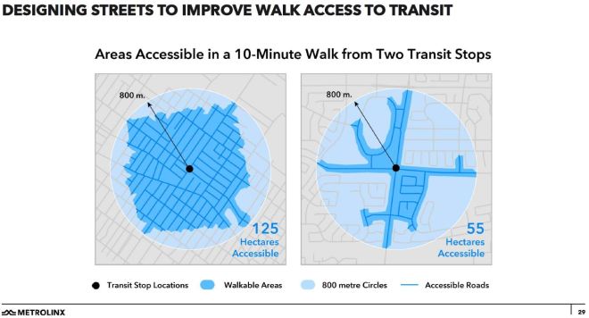 A pair of diagrams is intended to show what transit-oriented street design should look like. This is nothing new to anyone who thinks of what actually getting to a rapid transit station entails. In “old” cities, a dense grid of streets places a large area within “walking distance” of a node, whereas in “modern” suburbs, large areas can be cut off from transit through inward-facing development patterns that turn their back on main streets.