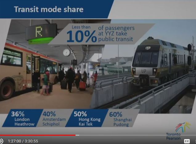 The GTAA has ambitions to become a first tier airport with over 50 million air passengers per year, but it lies far beyond major airports in Europe and Asia in the proportion of travellers who reach the airport via transit. Pearson’s transit share is just under 10% while transit provides far more of airport access internationally. Even Vancouver’s airport is over 30% showing how Toronto has fallen severely behind.