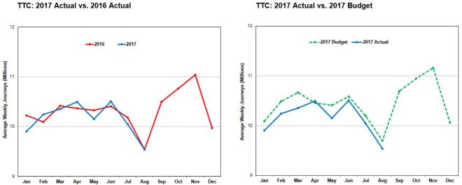 Through 2016, there appeared to be a recovery, but this has fallen off and the rate of increase is again negative. That turnaround in 2016 was responsible for an aggressive ridership target in 2017, although it was clear early in the year that this would not be achieved.