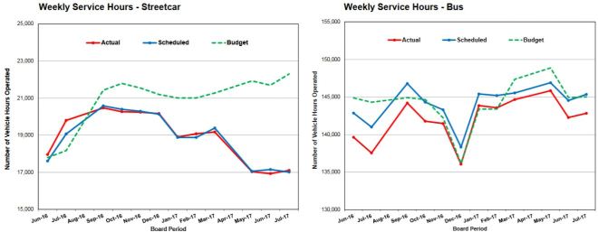 In the July 2017 Board Period, 22,305 streetcar weekly hours were budgeted for service, while 17,013 streetcar weekly hours were scheduled to operate, which represents a -23.7% variance.