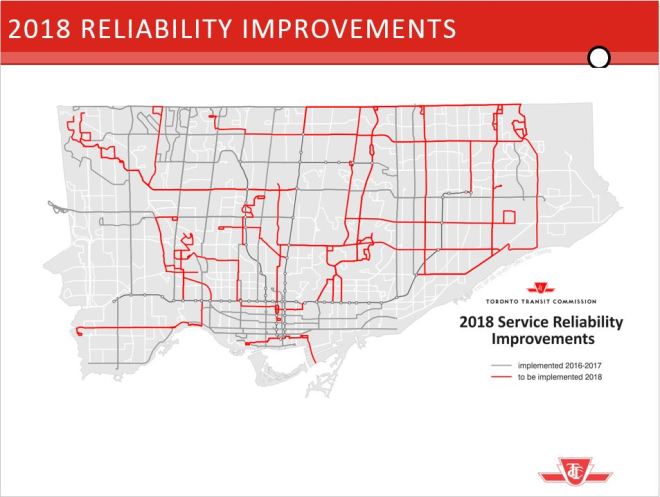 In 2018, the TTC plans to continue with schedule adjustments to improve performance on many routes as shown in this map.