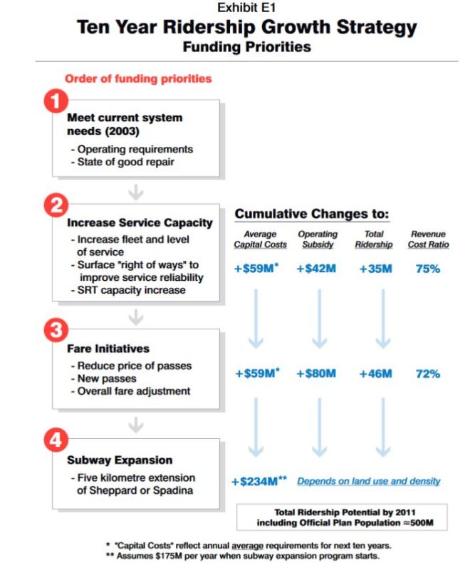 The strategy contained a mixture of proposals to be implemented over time including current operational and state of good repair funding, increased system capacity including surface rights-of-way and new larger trains for the SRT, fare structure changes to encourage use, and a modest extension of the subway network (either Sheppard East to STC or Spadina to York University). The revenue:cost ratio would be allowed to fall as a matter of policy to support increased service and new fare options.