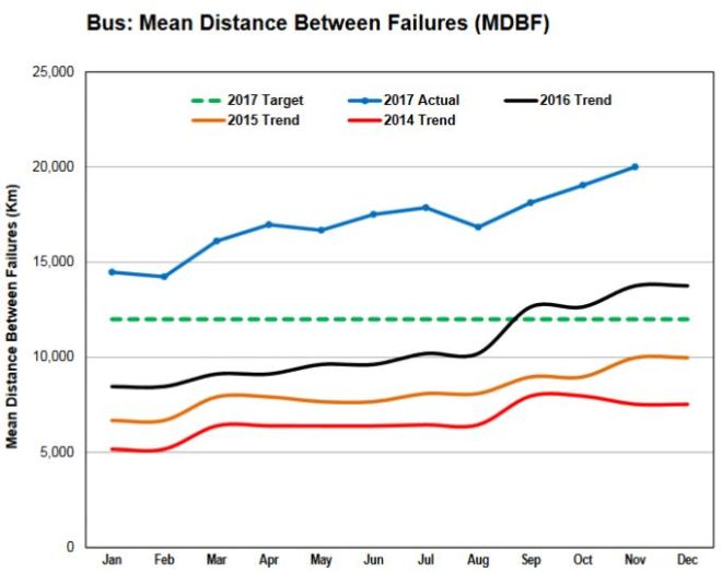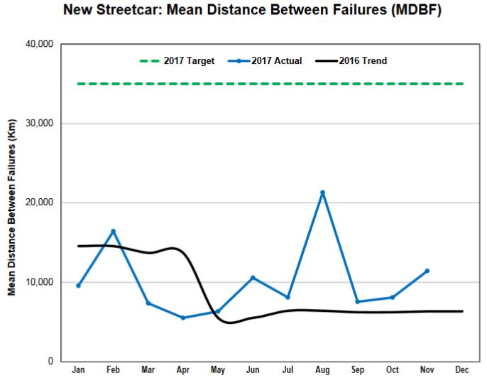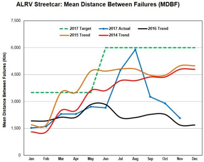 The reliability of the three streetcar fleets varies considerably. Note that in the following charts taken from the January 2018 CEO’s Report, the vertical scale is not the same for each chart.