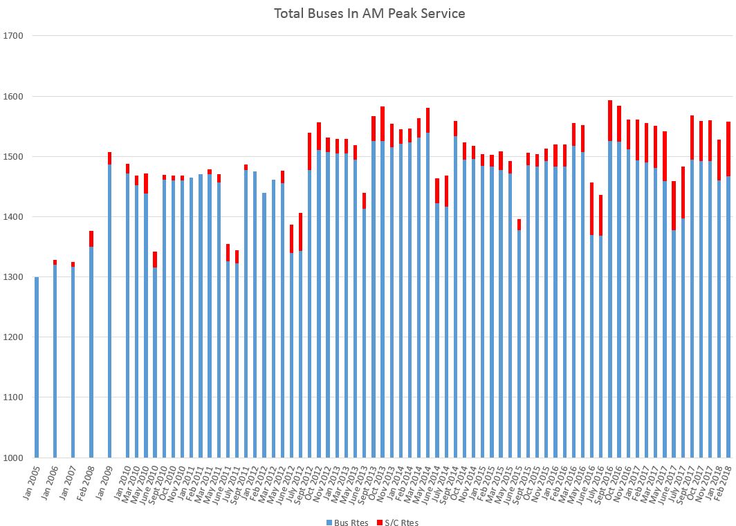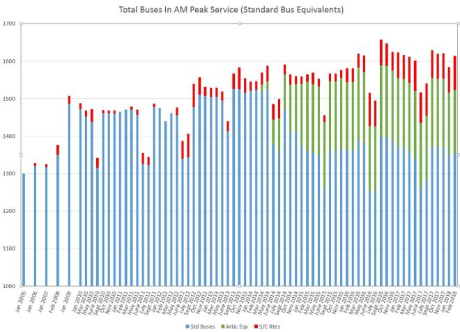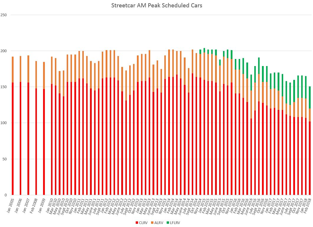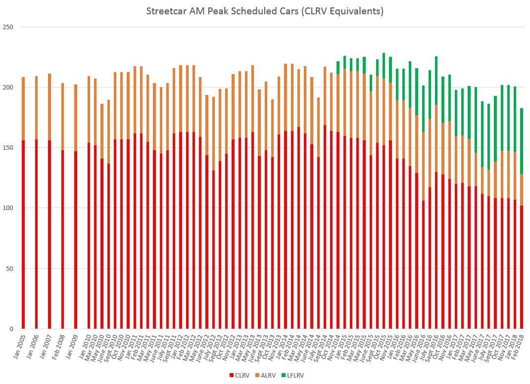 A full set of the bus and streetcar charts for both AM and PM peaks is available as a PDF below. The data are adapted from the Scheduled Service Summaries which are available on this site back to March 2008, and earlier from hard copies in my archives. (February 2018 is estimated from announced service changes.)