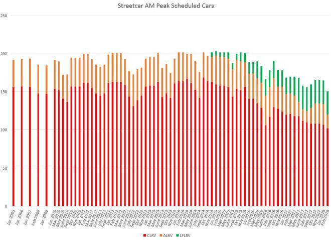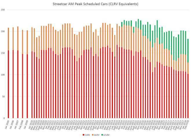What is evident here is that the scheduled service was more or less unchanged peaking at just over 200 cars during winter schedules until late 2015 when the new Bombardier Flexitys began to arrive. From that point onward, CLRV and ALRV retirements brought down the total scheduled service, and the larger size of the Flexitys has not completely offset the loss of the older cars. This brings us to February 2018 where two major routes, Carlton and Dundas, will be converted to bus operation although this is partly offset by a return of streetcars to Bathurst and Kingston Road, as well as an increase in the number of cars on Queen.