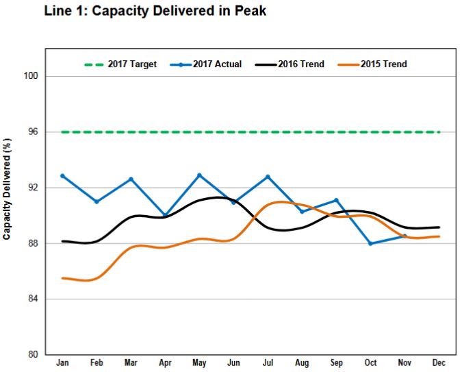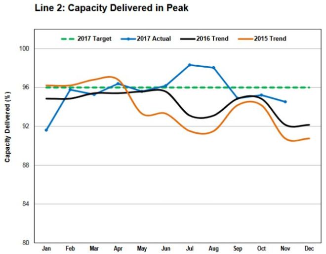 The jump in scheduled capacity in 2014 coincides with the introduction of the TR trains with about 10% greater capacity. As is quite clear here, that 10% was used up long ago and should not be spoken of as if it is a future addition to the service.