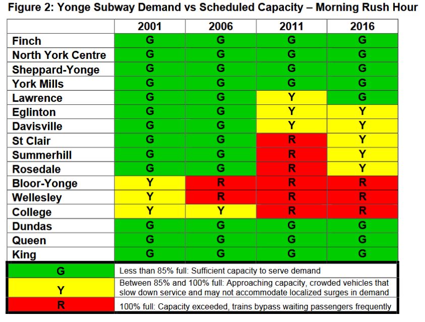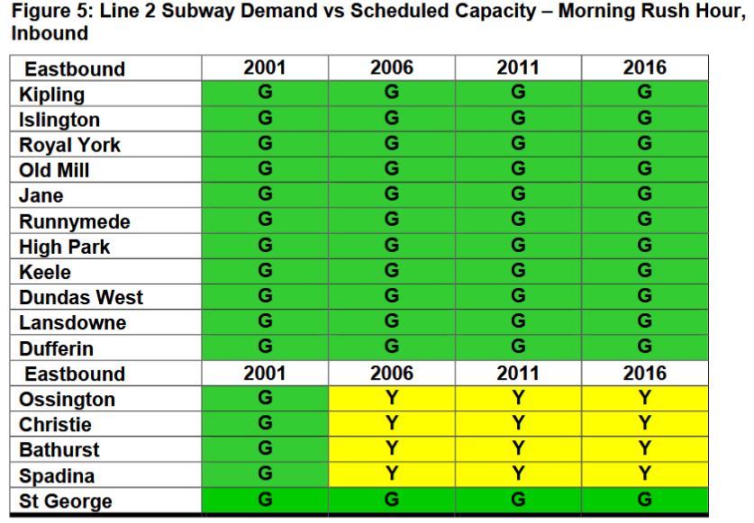 The Yonge-University subway routinely delivers 90% or less of the scheduled capacity, and therefore conditions that appear as borderline in the tables above are actually critical. It is essential that the TTC disaggregate the data so that service levels can be matched against the claimed crowding and capacities along the routes. Far too often, the TTC uses averaged data which hides the most severe problems.