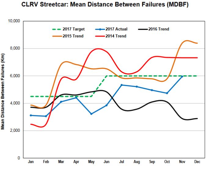 The reliability of the CLRVs shows a downward trend year by year from 2014 (red) to 2017 (blue), although this is not clear cut. Recent maintenance work on the CLRV fleet has improved its reliability in 2017 over the low point in 2016. Also evident here is the annual dip in reliability during winter months which are not kind to these cars’ subsystems, a fundamental design problem ever since they were delivered.