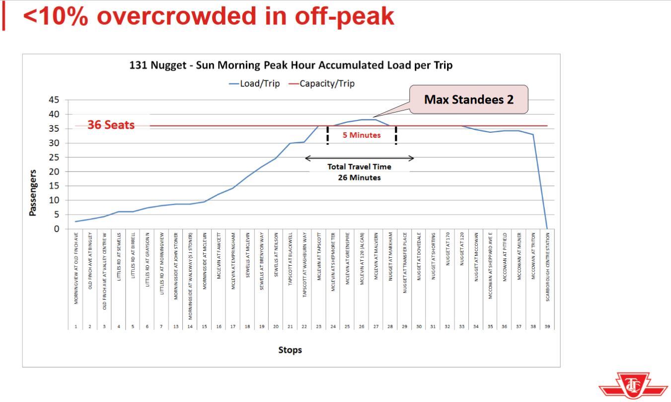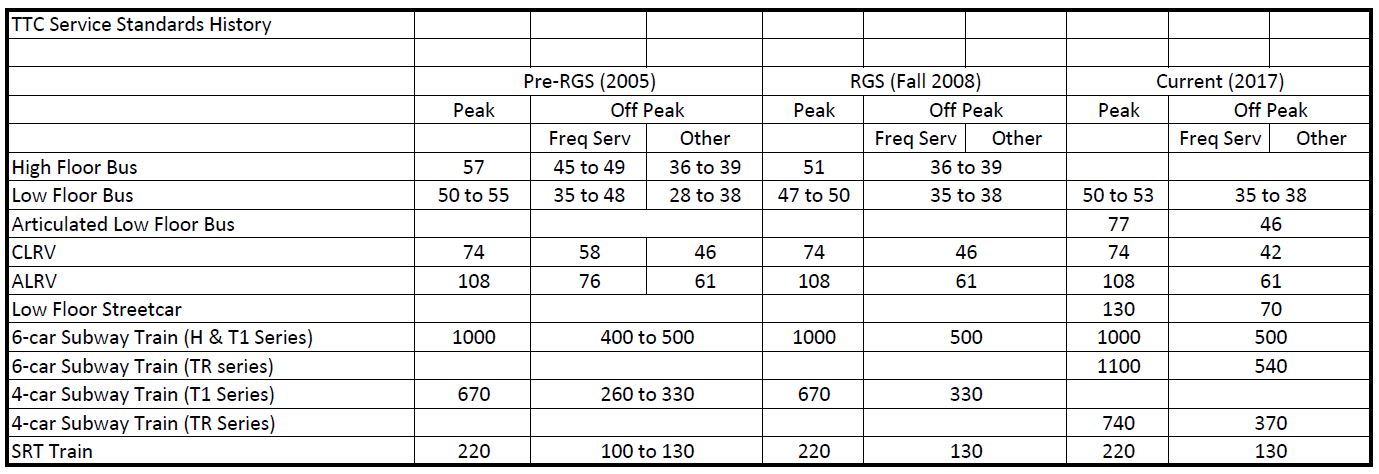After Mayor Tory was elected and he discovered the damage Ford had done (a rather disingenuous stance for someone who ridiculed the need for more buses during his election campaign), the standards reverted somewhat back toward RGS levels with peak bus loads set half way between the Miller and Ford standards.